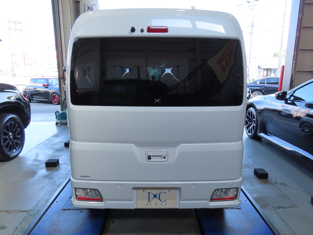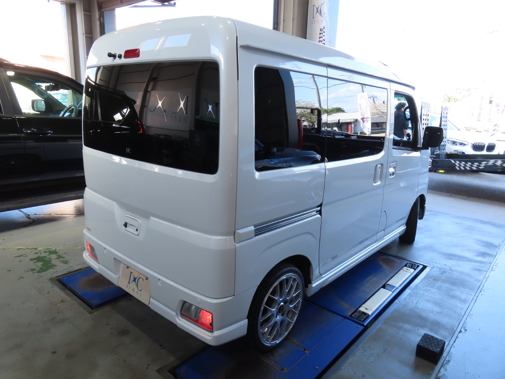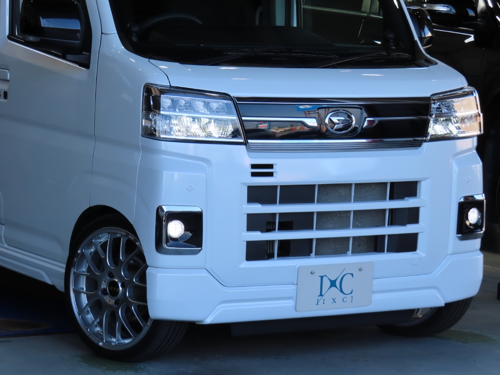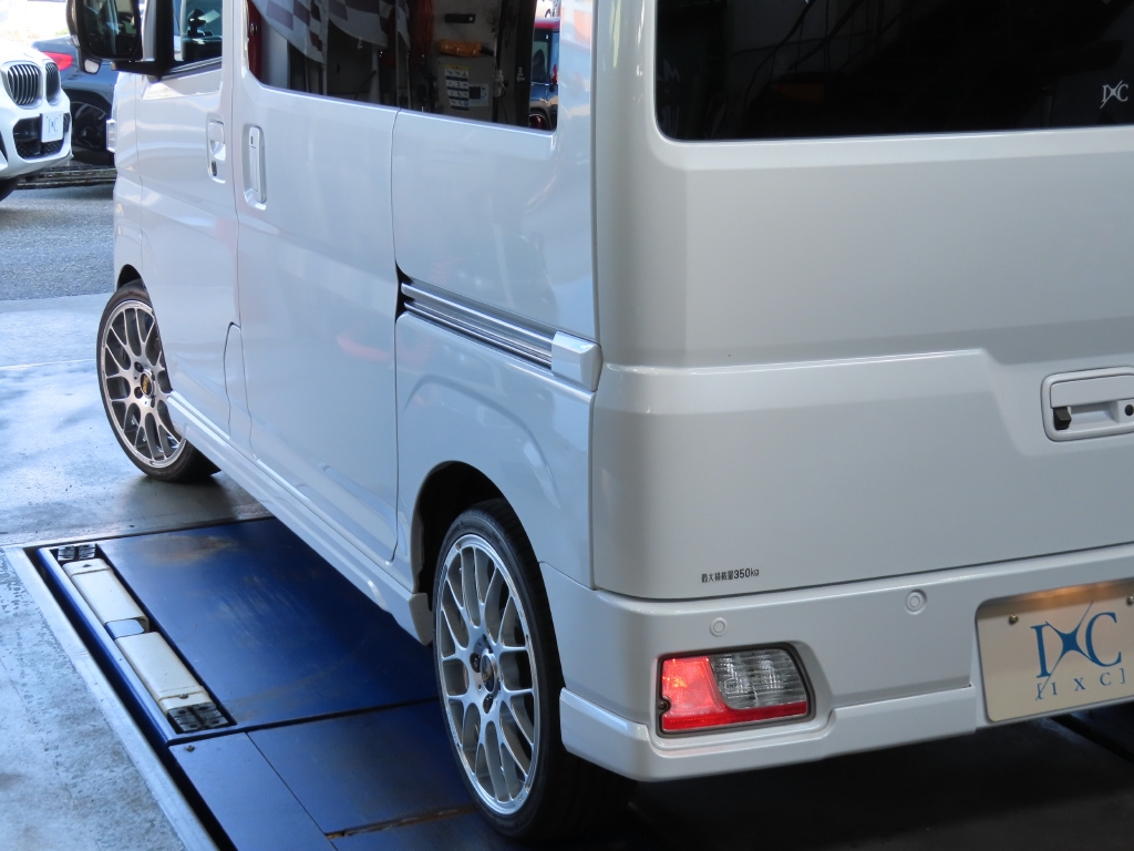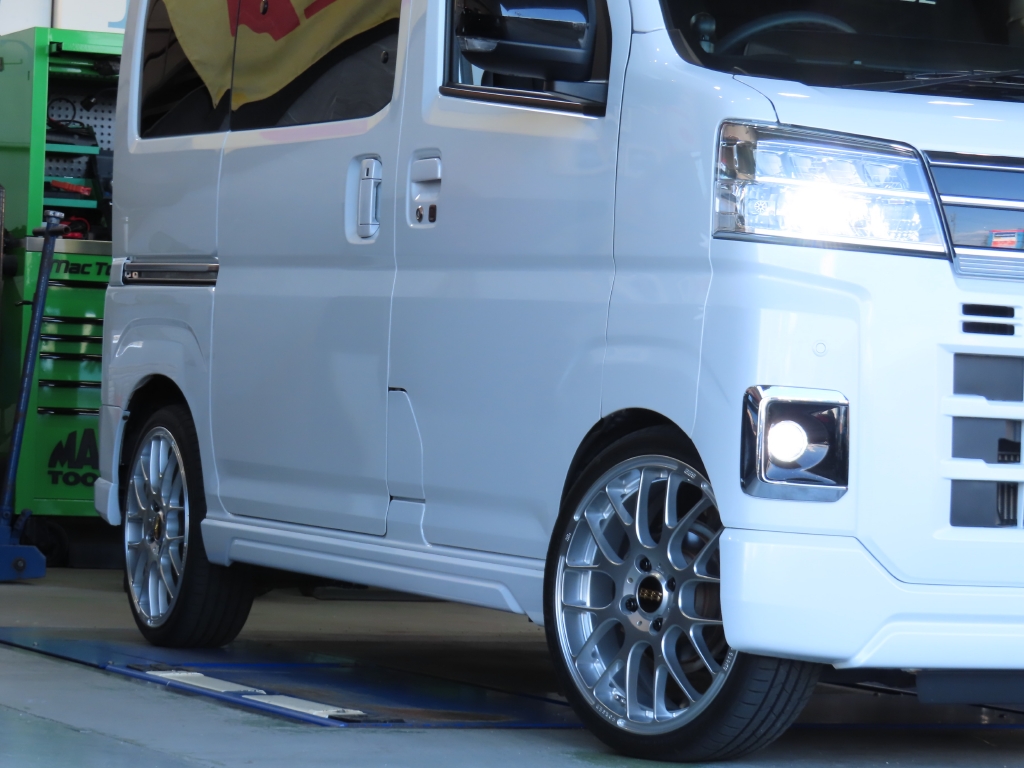 外観では、バンパー下部のブラック部分をボディ同色のパールホワイトへマッチペイントすることで統一感を高め、さらにBBS製アルミホイールを装着。